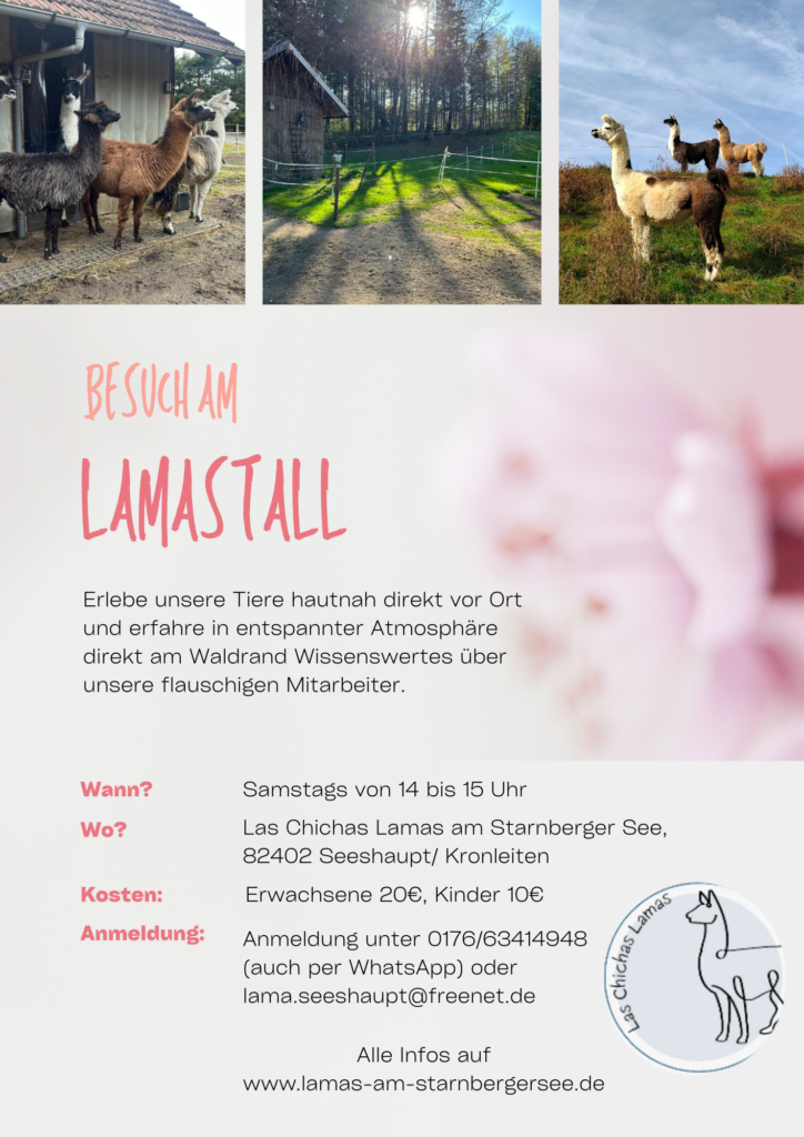 Termine Immer Samstags, 14:00-15:00 Uhr Besuch am Lamastall Zur Buchung Immer Samstags, 14:00-15:00 Uhr Besuch am Lamastall Zur Buchung Sonntag, 1.3.2026 14:00 Uhr Achtsamkeitswanderung ca. 1,5h Zur Buchung Sonntag, 8.3.2026 14:00 Uhr Achtsamkeitswanderung ca. 1,5h Zur Buchung Sonntag, 1.3.2026 14:00 Uhr Achtsamkeitswande-rung ca. 1,5h Zur Buchung Sonntag, 8.3.2026 14:00 Uhr Achtsamkeitswande-rung ca. 1,5h Zur Buchung Sonntag, 1.3.2026 14:00 Uhr Achtsamkeitswanderung ca. 1,5h Zur Buchung Sonntag, 8.3.2026 14:00 Uhr Achtsamkeitswanderung ca. 1,5h Zur Buchung